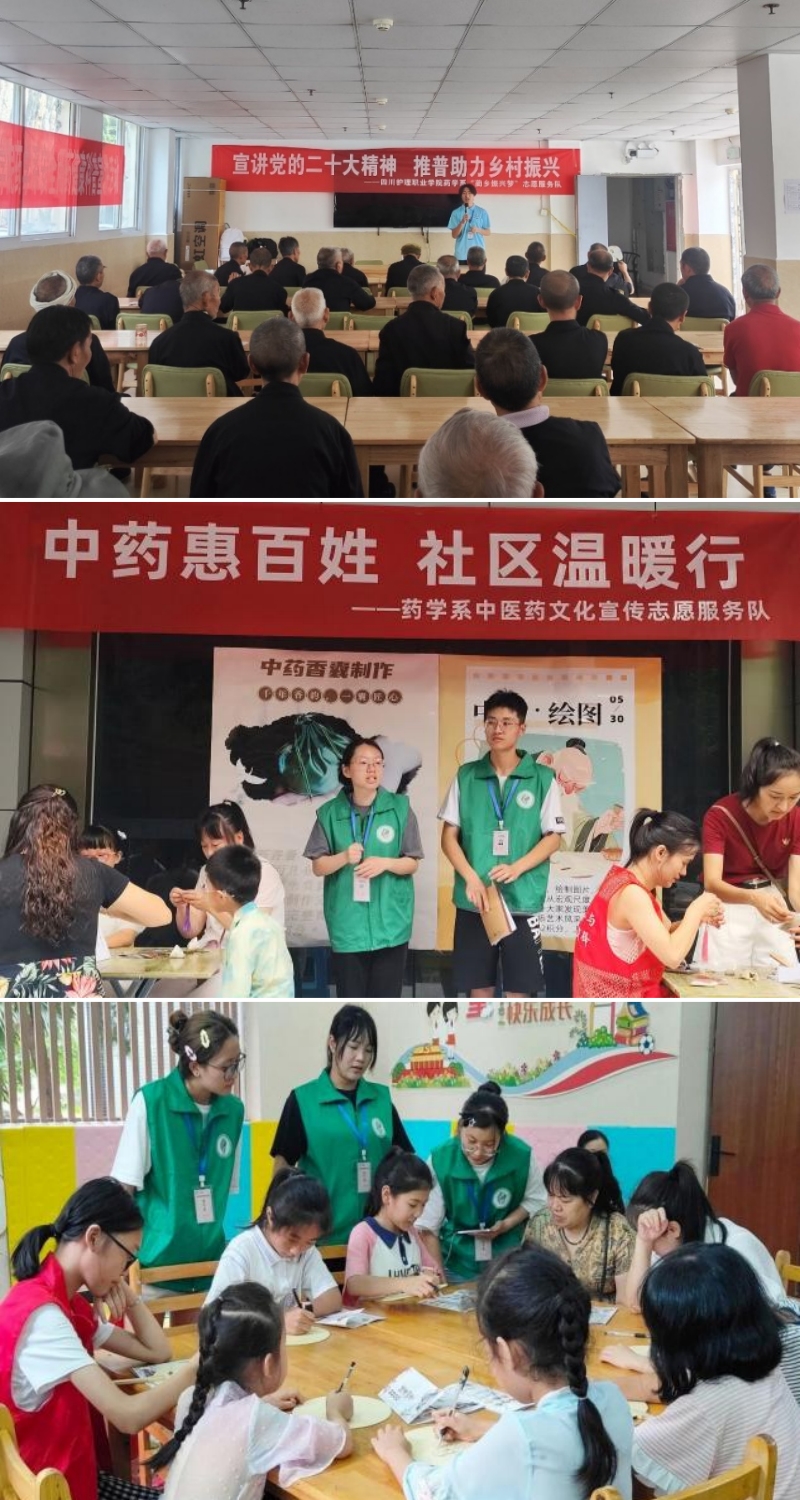 中医药文化进基层,推普助力乡村振兴。志愿服务队将普通话推广工作与宣传中医药文化工作结合,在古蔺县双沙镇开展“宣讲党的二十大精神 推普助力乡村振兴”活动。在成都市龙泉驿区十陵街道石灵社区、德阳市旌阳区新中镇龙居村开展“说普通话 识中药材”研学活动。志愿者们用浅显易懂的话语向居民们介绍草药的特点和功效,通过制作香囊,绘画中药材等方式,科普中药文化知识,助力中草药文化的传承与发展。