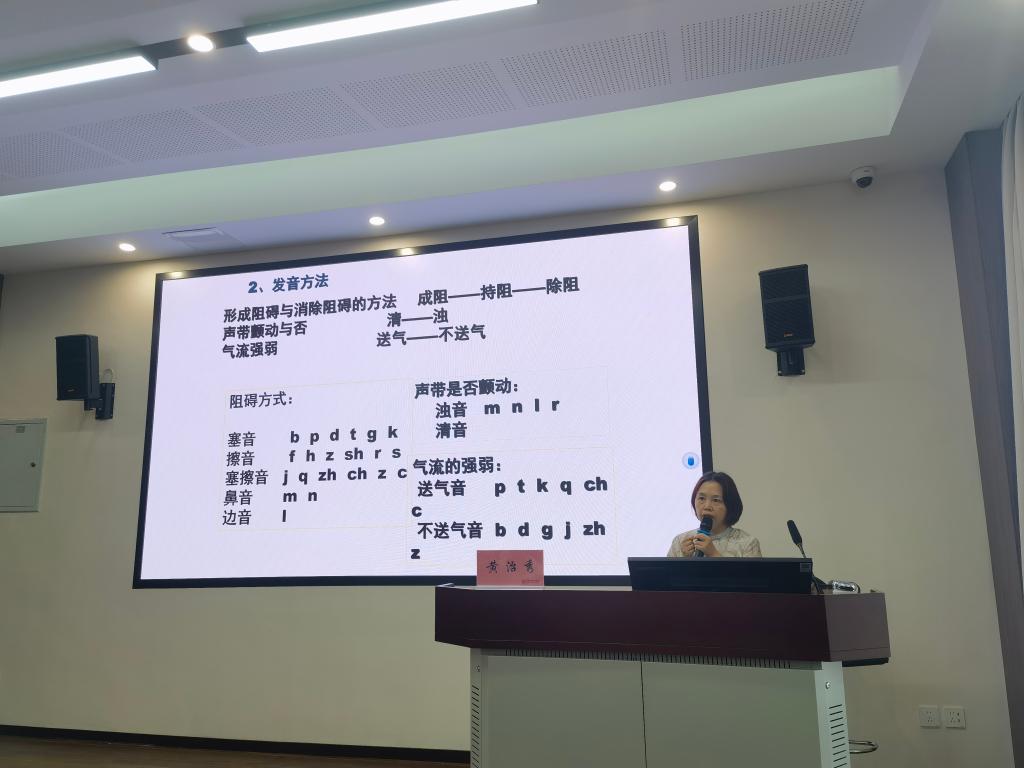 黄治秀介绍了普通话作为全国通用标准语言的发展过程及意义,从发音方法、普通话测试流程、答题规范和技巧等方面深入浅出地做了细致讲解,尤其对部分地区发音易错点结合案例进行了分析和指导。培训课堂气氛活跃,学生积极参与互动,黄治秀鼓励大家要通过多种方式培养良好说话习惯,坚持用普通话交流,坚持多听多学勤练且及时纠错,循序渐进提高普通话水平。