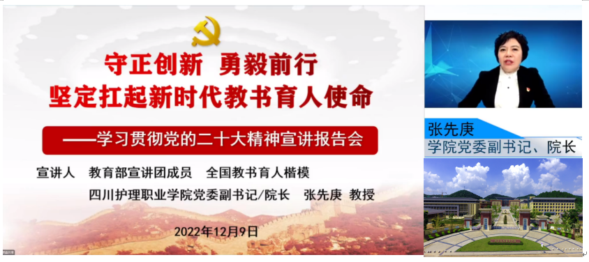 为深入学习宣传贯彻党的二十大精神,不断汇聚奋进新征程、建功新时代的强大力量,12月9日,全国高校学习宣传党的二十大精神师生巡讲团成员、全国教书育人楷模、第七届全国黄炎培职业教育杰出校长、学院党委副书记、院长张先庚教授为全校师生线上作了题为《守正创新  勇毅前行  坚定扛起新时代教书育人使命》的党的二十大精神宣讲,共1.2万人次师生观看。