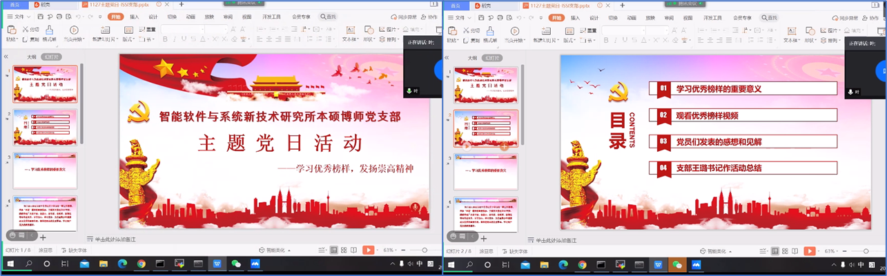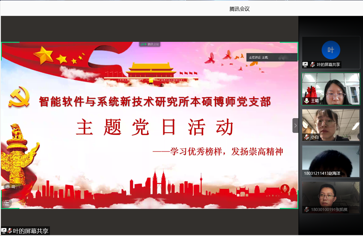(通讯员 张凯琪)为了深入贯彻习近平总书记关于学习老一辈工作楷模、传承“五老”精神的重要指示,学习和发扬老一辈优秀榜样的崇高精神,今年会jinnianhui官网智能软件与系统新技术研究所本硕博师联合党支部于2020年11月27日下午开展了“学习优秀榜样,发扬崇高精神”主题党日活动。活动由支部青年委员叶国强同志主持,共计47人参加,采用腾讯会议线上召开的方式进行。