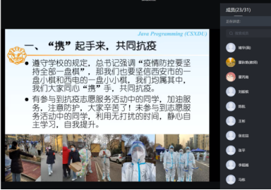 霍秋艳老师在《JAVA程序设计》课程的第一课中,特别讲述了计科院2019级学生张玉鉴为抗疫贡献出的西电网红云应用“XDer今天吃什么”的实际,鼓励大家向身边的榜样学习,充分发挥专业优势,积极作为,用专业所学真正服务身边的同学。同时以自己和学院多名老师积极承担志愿者的事例激励大家,疫情期间放稳心态,积极参加志愿者活动,充分利用无打扰时间提升自我,同心携手,共同抗疫。