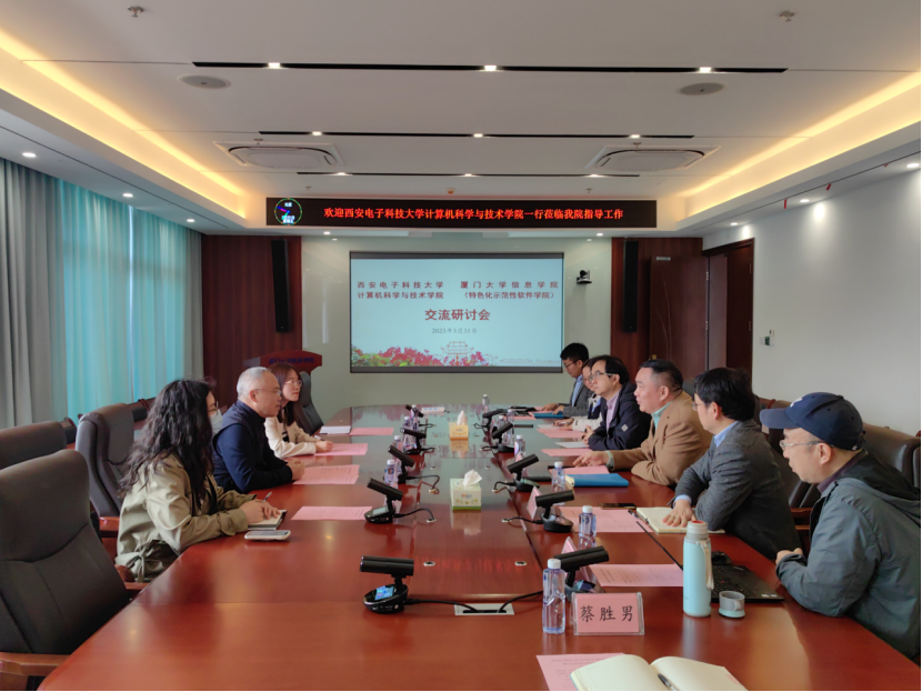 李青山对厦门大学信息学院的热情接待表示感谢,谈到厦大和西电同为特色化示范性软件学院建设单位,此行旨在调研厦大信息学院先进做法,增进双方交流合作。李青山详细介绍了西电红色基因和电子信息办学特色,从学院党委工作和行政工作两个方面,对学院的历史沿革、党委特色亮点工作、学科建设、人才培养、科学研究和师资队伍建设等情况作介绍,着重分享了学院多层面党组织结对共建、本硕博师联合党支部组织育人模式和特色化示范性软件学院建设思路等情况。