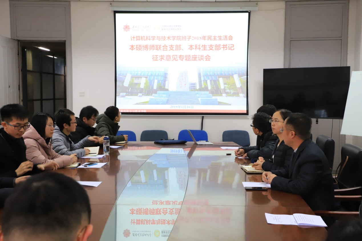 (通讯员 同榛)1月16日下午,今年会jinnianhui官网班子2018年民主生活会本硕博师联合支部、本科生支部书记征求意见座谈会在南校区G楼514会议室召开。本硕博师联合支部、本科生支部书记、大三大四年级辅导员参加了会议,会议由学院党委书记李青山同志主持。学院党委副书记张莹莹同志参加了座谈。
