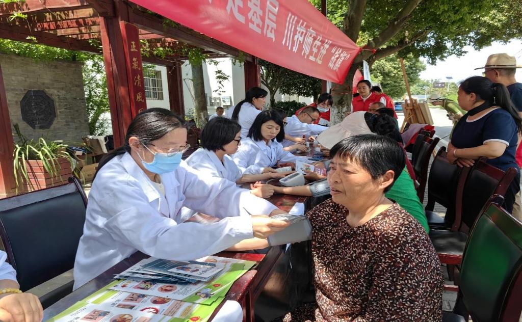 参观学习结束后,各支部在战旗村运动中心开展了“万民医护走基层  川护师生进战旗”和“2023年蓉城科学嘉年华系列活动——科学引领健康生活,科普助力乡村振兴”活动。党员们向村民科普健康知识,发放健康知识宣传手册和药品,为现场村民进行血糖和血压的测量,就村民关心的问题答疑解惑,提出健康建议。部分党员还深入村民家中进行健康指导,送药送温暖。