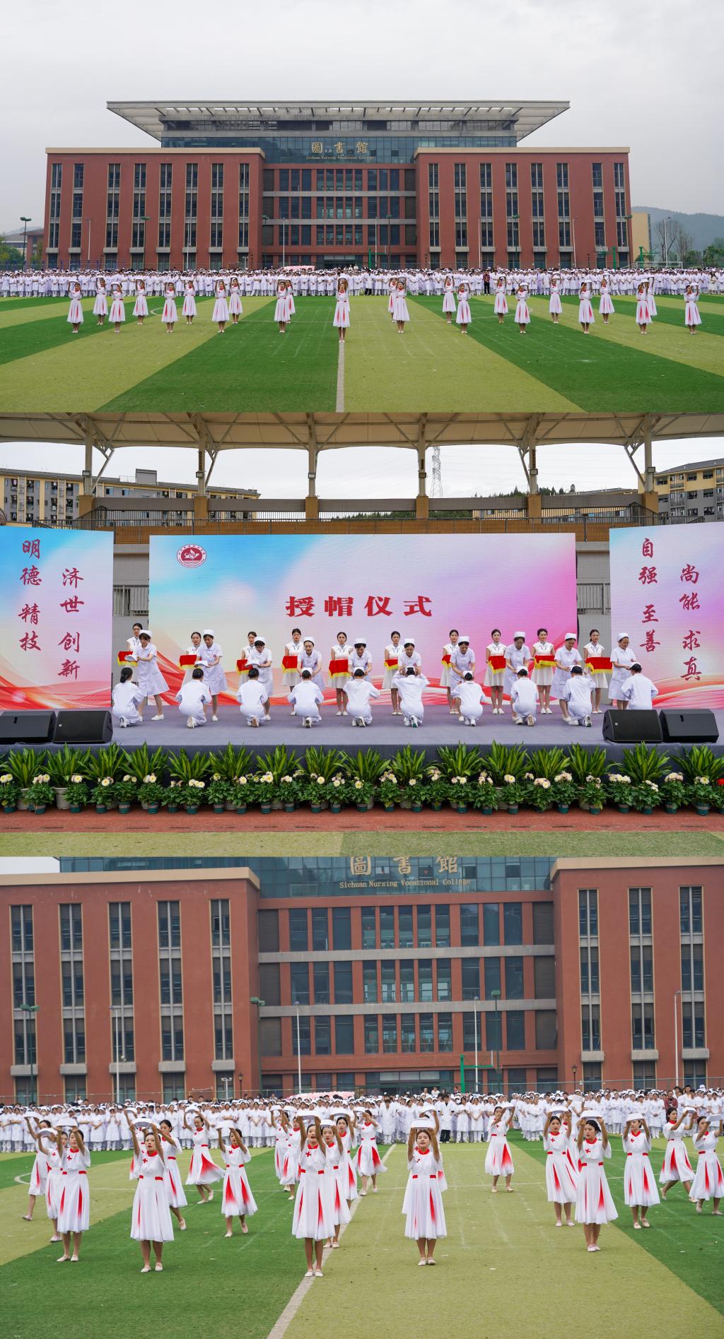 在悠扬的《希波克拉底誓言》的乐曲中,120名护生代表身着白衣,手捧燕帽,迈着整齐而坚定的步伐走向操场中间迎接他们人生中的重要时刻。燕尾为冠承使命,初心如烛传大爱。全国教书育人楷模、全国黄炎培职业教育杰出校长、学院院长张先庚、副院长梁小利等十位专家为他们戴上圣洁的燕尾帽,学生接过神圣的红烛,这庄严的时刻,是祝福和嘱托的传递,更是责任与担当的传承。在张先庚院长的带领下,全体学生举起右手进行庄严的宣誓。“我志愿献身护理事业,热爱护理专业……”,铮铮誓言催人奋进,护理学子接续奋斗,拳拳初心令人动容,“四有青年”赤诚告白。南丁格尔榜样在前,护理精神薪火相传,最美教师率先垂范,川护学子责任在肩。铿锵有力的誓词久久回荡在校园的上空,护理工作的崇高和光荣、责任和奉献镌刻在每一个人的心房,他们必将信念,怀揣理想,为健康四川健康中国贡献年轻的力量。