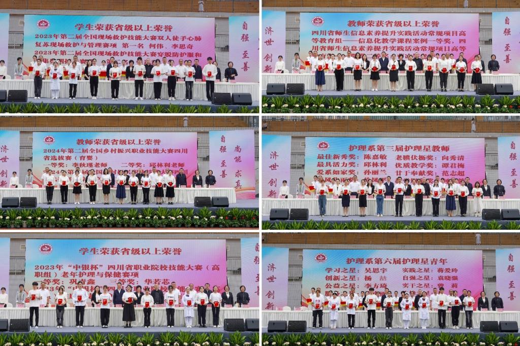 活动在庄严肃穆的国歌声中拉开序幕。学院党委书记江涛为本次活动致辞。致辞中,他首先代表学院领导班子向辛勤工作的教职工和勤奋学习的同学们致以崇高的敬意和节日的祝贺!学院深入贯彻党的教育方针,全面落实立德树人根本任务,弘扬“五爱五尽”家校情怀,推进“五大强校”战略,培养了一批又一批情怀深、技能精、善创新、讲奉献的优秀护理技能人才,为护理事业的发展贡献着智慧与力量。江书记对承载着护理事业的希望的护理学子提出三点寄语:一要坚定理想信念,厚植家国情怀,做到“眼中有光”,以理想照亮前程。二要勤学知识技能,锤炼过硬本领,做到“脚下有路”,以奋斗书写答卷。三要立足实践创新,勇挑时代重担,做到“肩上有责”,以担当彰显力量。希望同学们传承川护大爱,助力基层健康卫生事业,把个人的奋斗融入全面推进中华民族伟大复兴的火热实践中。