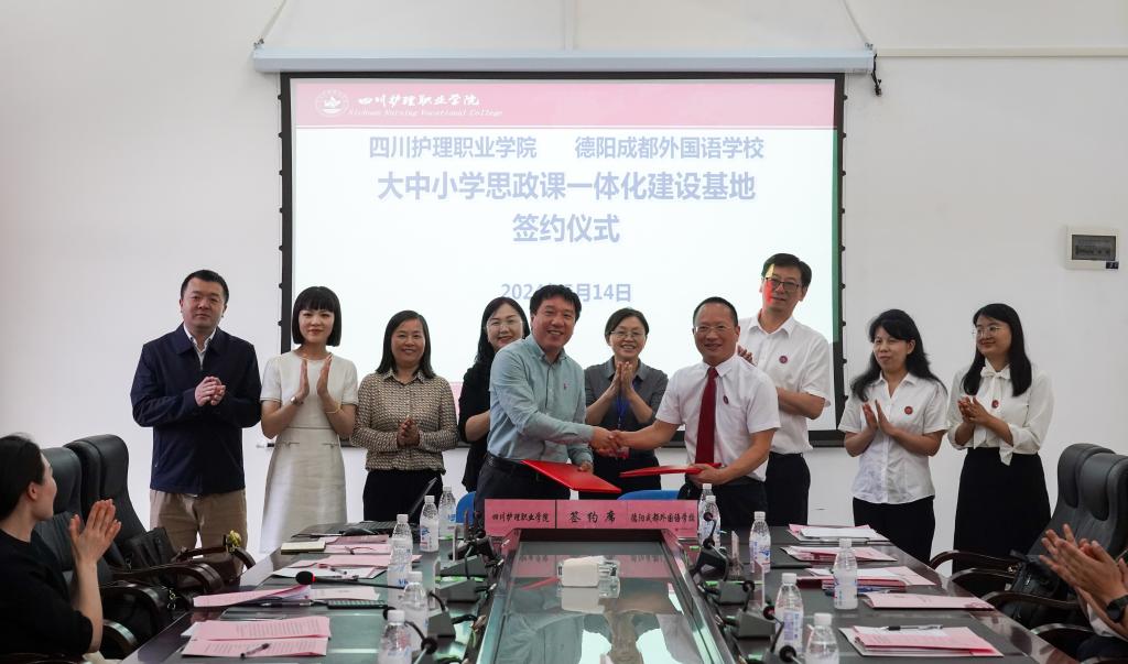 为充分发挥思政课立德树人关键作用,全面增强思政育人效果,促进青少年学生健康成长成才,5月14日上午, 学院与德阳成都外国语学校在学院德阳校区举行大中小学思政课一体化建设基地和青少年生命健康教育科普研学基地签约揭牌仪式。德阳市委两新组织工委党建指导员、德阳市民办教育协会秘书长吕霞,学院党委副书记彭博文,德阳成都外国语学校党委书记、校长张会能出席会议。会议由学院副院长梁小利主持。