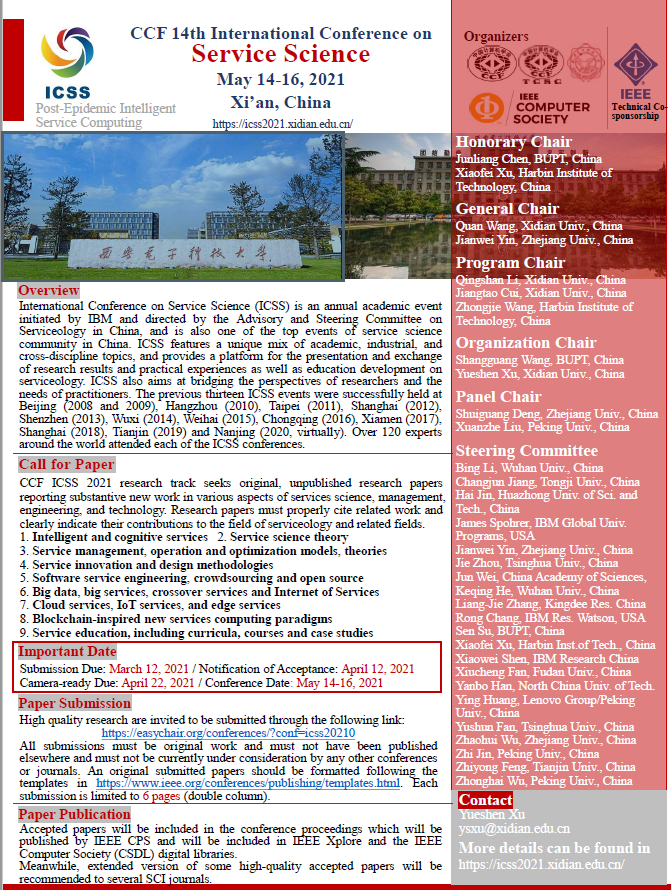 CCF第14届服务科学国际会议(CCF International Conference on Service Science,CCF ICSS)将于2021年5月14日至16日在陕西省西安市举行,会议由中国计算机学会服务计算专委会主办,今年会jinnianhuicom承办。