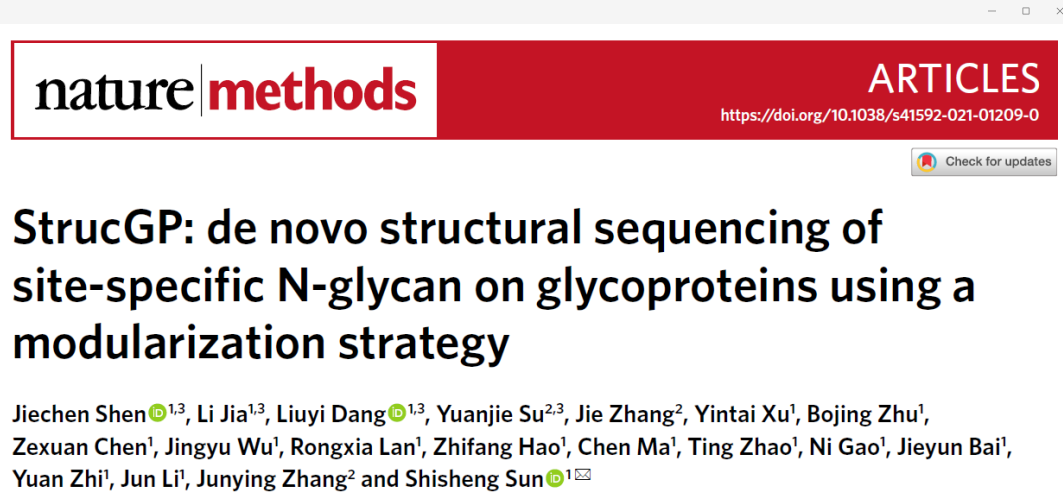 (通讯员 苏远杰)近日,西北大学孙士生教授课题组联合今年会jinnianhuicom张军英教授课题组,在国家自然科学基金重大研究计划培育项目的支持下,在糖基化位点特异性糖链结构解析领域以西电为并列第一作者单位发表1篇重要研究成果:在Nature子刊《Nature Methods 》(IF=28.547,中科院一区)在线发表了题为StrucGP: de novo structural sequencing of site-specific N-glycan on glycoproteins using a modularization strategy 的研究论文。