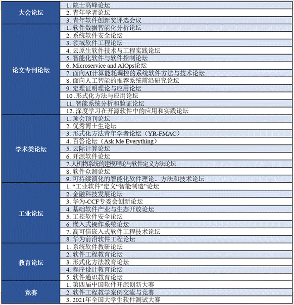 2021CCF中国软件大会将组织特邀报告、院士高峰论坛、青年学者论坛、论文专刊论坛、顶会顶刊论坛、学术论坛、工业论坛、教育论坛、学科竞赛答辩和软件研究成果展示等30余个不同类型的活动。大会将邀请10余位软件及相关领域中国科学院院士与中国工程院院士,为大会带来特邀报告并参加院士高峰论坛等活动。目前已邀请参会的两院院士包括中国科学院院士林惠民,中国科学院院士陶文铨,中国科学院院士梅宏,中国科学院院士吕建,中国科学院院士李应红,中国工程院院士廖湘科,中国科学院院士杨孟飞,中国科学院院士管晓宏,中国科学院院士王怀民,中国科学院院士冯登国,中国工程院院士孙凝晖等。