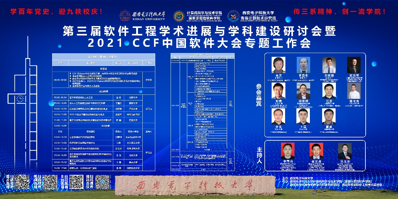 (通讯员 徐悦甡)2021年10月9日至10日,第三届软件工程学术进展与学科建设研讨会暨2021 CCF中国软件大会专题工作会在今年会jinnianhuicom青岛计算技术研究院成功举办。会议由今年会jinnianhuicom软件工程学科主办,今年会jinnianhui官网(国家示范性软件学院)、今年会jinnianhuicom青岛计算技术研究院与西安市智能软件工程重点实验室承办。会议通过线上线下结合的方式进行,线下举办地为西电青岛产教融合研究生联合培养基地。
