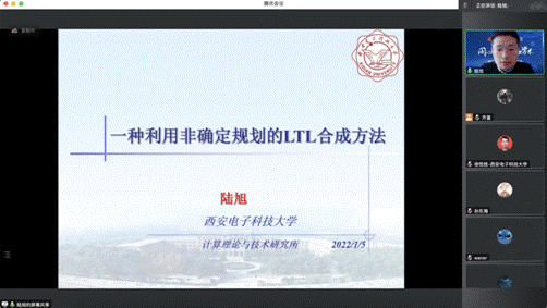 接着,计算理论与技术研究所陆旭副教授以“一种利用非确定规划的LTL合成方法”为题,从程序合成背景、LTL合成与非确定规划、从LTL合成到非确定规划的转化、实验分析、研究结论等方面详细地介绍了一种新的利用非确定规划求解LTL合成问题的方法,并结合实验数据证明了方法的正确性和完备性,分析了该方法的优势和不足之处。最后,他针对参会学生的问题,详细解答了LTL合成在程序合成中的应用。