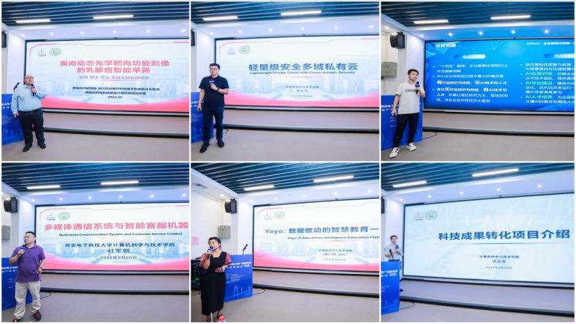 在项目路演环节中,企业与研究团队就项目的核心技术研发能力、项目市场前景等方面展开了深入探讨和紧密互动。本次活动共计25个路演项目,其中单兵便携式LTE侦码设备、智能客服机器人、轻量级安全多域私有云、普惠型工业互联网ICT大脑、面向动态光学靶向功能影像的乳腺癌智能早筛、YOYO智慧教育平台、AIFlow企业智能化转型一站式解决方案等7个项目技术负责人现场进行路演,其余18个项目集中讲解。