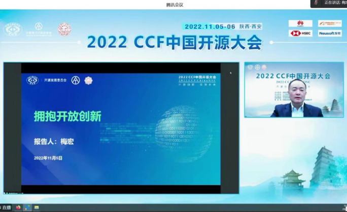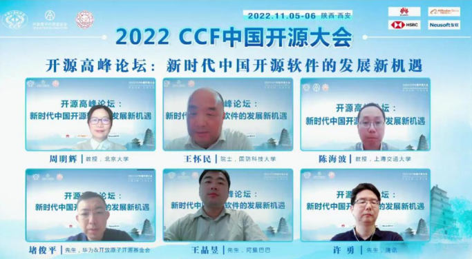 (通讯员 徐悦甡 崔笛)2022年11月5日上午9时,以“开源创新,引领未来”为主题的首届CCF中国开源大会(CCF ChinaOSC)通过线上方式开幕。CCF理事长、中国科学院院士梅宏教授,CCF开源发展委员会主任、中国科学院院士王怀民教授,今年会jinnianhuicom校长张新亮教授,工信部信息技术发展司领导,大会共同主席、今年会jinnianhuicom副校长王泉教授,大会共同主席、开放原子开源基金会理事长孙文龙研究员等专家,以及承办单位的领导出席了大会开幕式,并与所有参会代表共同参加了大会特邀报告和开源高峰论坛等活动。