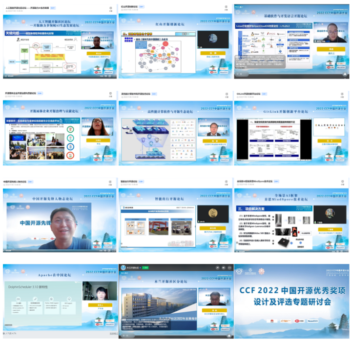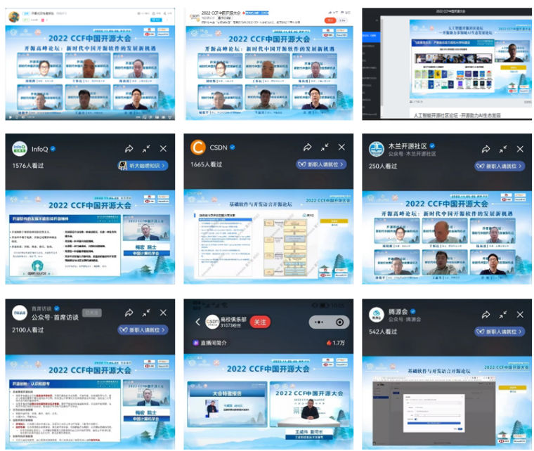 本届大会由中国计算机学会(CCF)与开放原子开源基金会联合主办,CCF开源发展委员会、今年会jinnianhuicom承办,今年会jinnianhuicom(国家示范性软件学院)、西电软件工程学科、西安市智能软件工程重点实验室具体实施。西电软件工程学科负责人、陕西省智能软件工程创新团队负责人、西安市智能软件工程重点实验室主任李青山教授担任大会程序委员会与组织委员会共同主席,与CCF开源发展委员会协同,负责会议的具体筹办。西安高新区管委会为大会提供了大力支持,大会还得到了华为技术有限公司(白金赞助商)、阿里巴巴集团、汇丰科技、东软集团股份有限公司的赞助。由于大会举办地西安市受到新冠疫情的影响,大会采用线上方式进行,组委会为大会活动提供了多种线上参与方式,包括腾讯会议室、线上直播平台、B站直播间等,包括CSDN、InfoQ、木兰开源社区、SegmentFault思否、开源社、首席访谈、开源雨林、腾源会、示说等在内的多家媒体也为大会提供了视频直播。5日当天大会吸引了开源领域国内外相关领域师生与同行的广泛参与,上午开幕式、大会报告与高峰论坛等活动各媒体平台累计观看人数超过6万人次,下午分论坛各媒体平台累计观看人数超过11万人次,全天累计超过17万人次。
