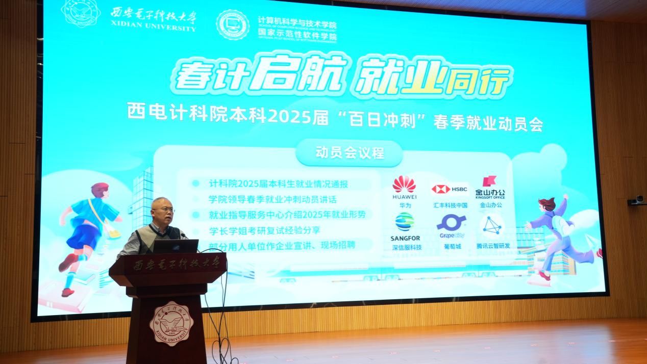 3月14日下午,计科院组织“春计启航·就业同行”——百日冲刺春季就业动员会,学院党委书记李青山、就业指导服务中心詹奉珍、学院分管本科学生工作相关负责同志,以及计科院200余名本科生参与活动。动员会现场搭起就业推荐平台,邀请了华为、汇丰科技中国、金山办公、深信服科技、葡萄城、腾讯云智研发六家企业作宣讲和现场招聘。