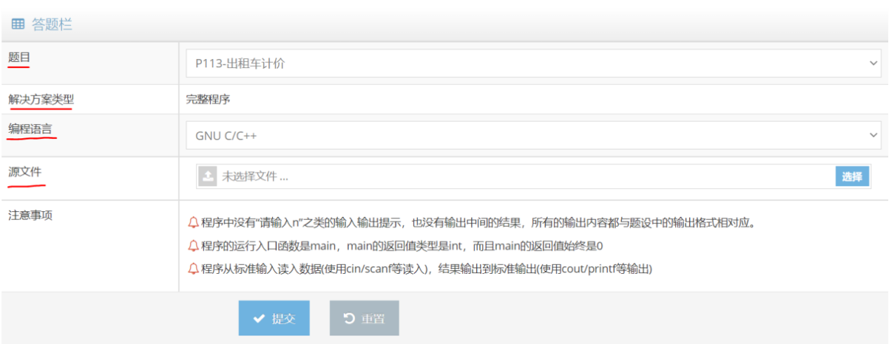 4.题目设置为提交“程序片段”和“完整程序”两种,提交解答时注意查看题目的解决方案类型: